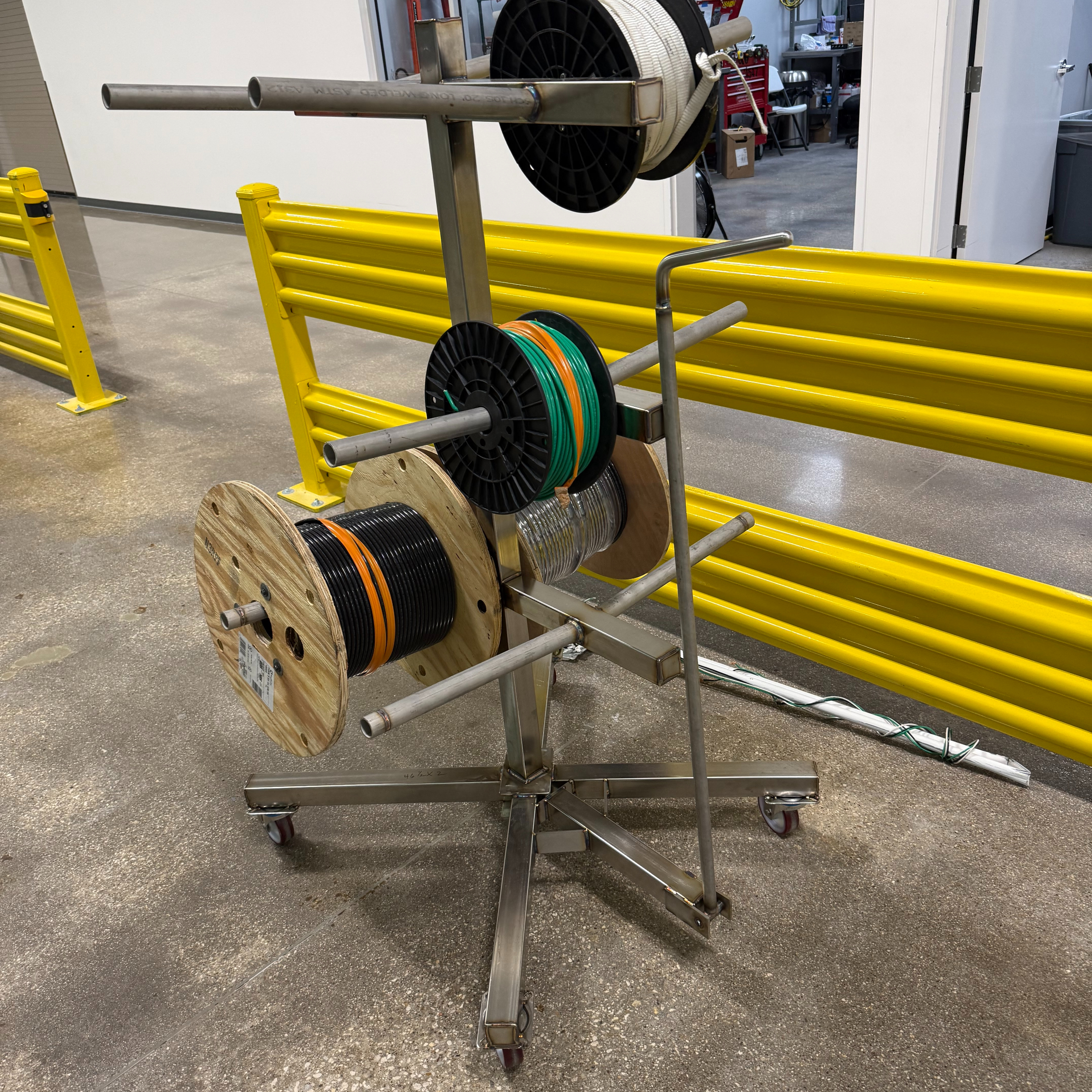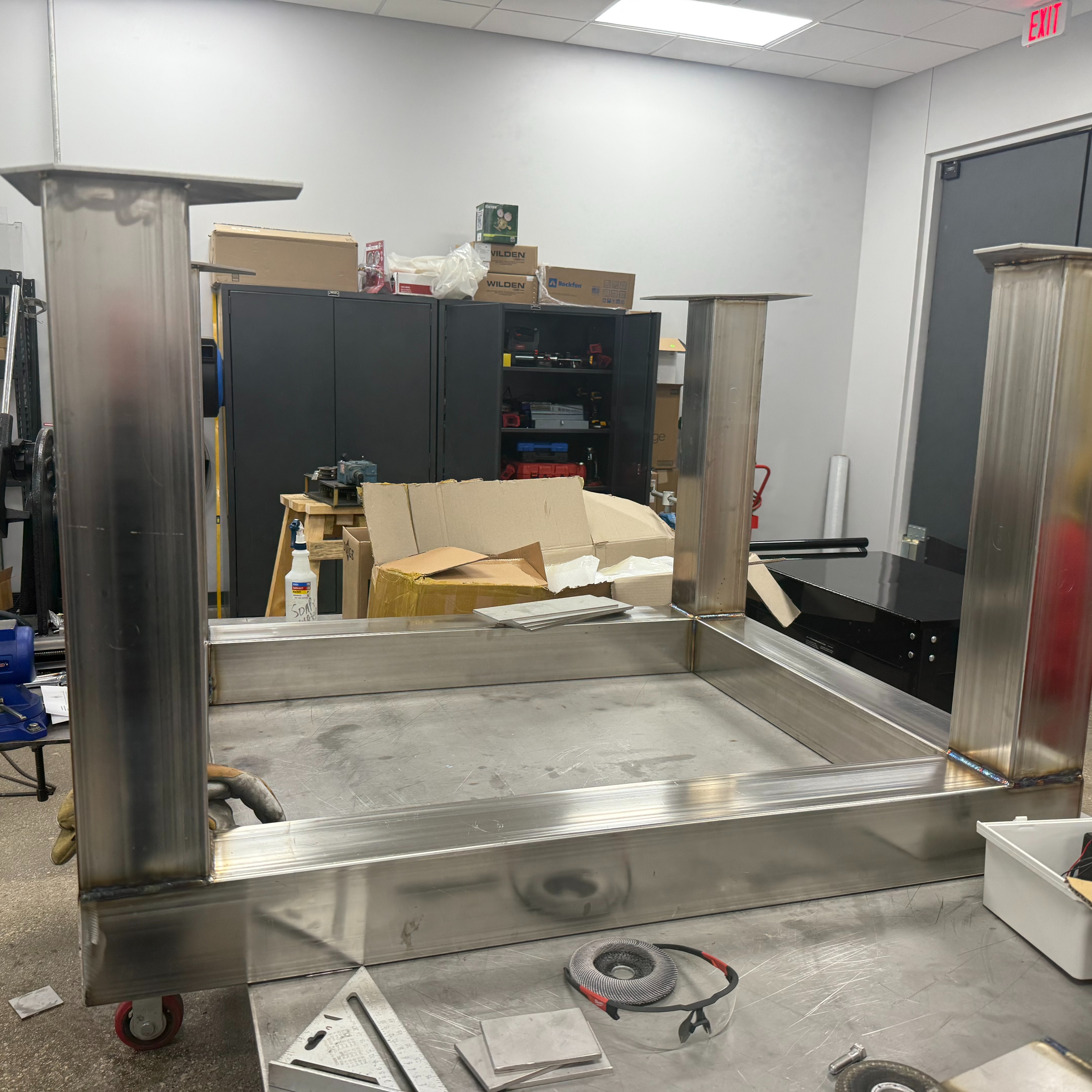 Custom metal fabrication including brackets, racks, structural steel, and sanitary stainless TIG welding for food and cosmetic systems.
